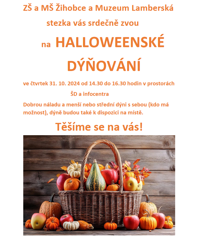 Těšíme se na vás ve čtvrtek 31. 10. 2024 od 14:30 v infocentru a ve školní družině.
